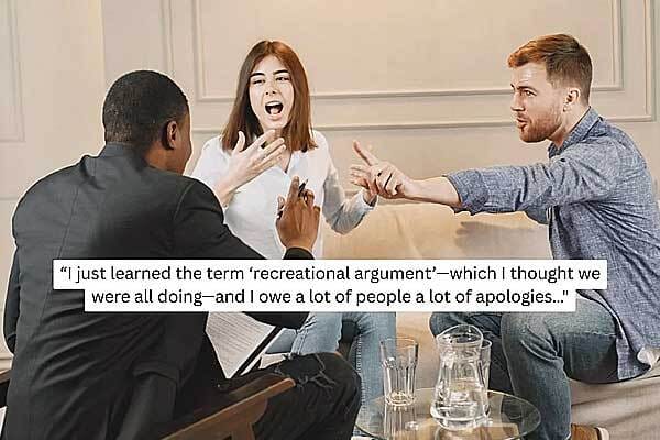 A woman's realization that she grew up in the latter kind of family has prompted discussions about the whole idea and has people from all kinds of backgrounds feeling seen. Emmaline (@emmaleendryer) shared in a video, "As someone who came from a recreational argument family…I just learned the term "recreational argument", which I thought we were all doing, and I owe a lot of people a lot of apologies."